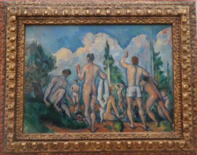 scènes leur tension particulière : les figures sont à la fois présentes et sur le point de disparaître dans leur environnement. Les baigneurs·ses de Cezanne associent la tradition classique du nu à une approche moderne de la forme et de l’espace.